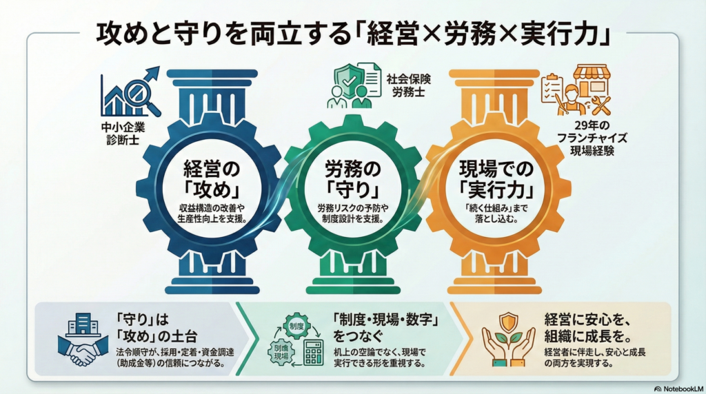 労務・人材定着・制度活用(助成金・補助金)を、現場目線で“実行できる形”に落とし込みます。
